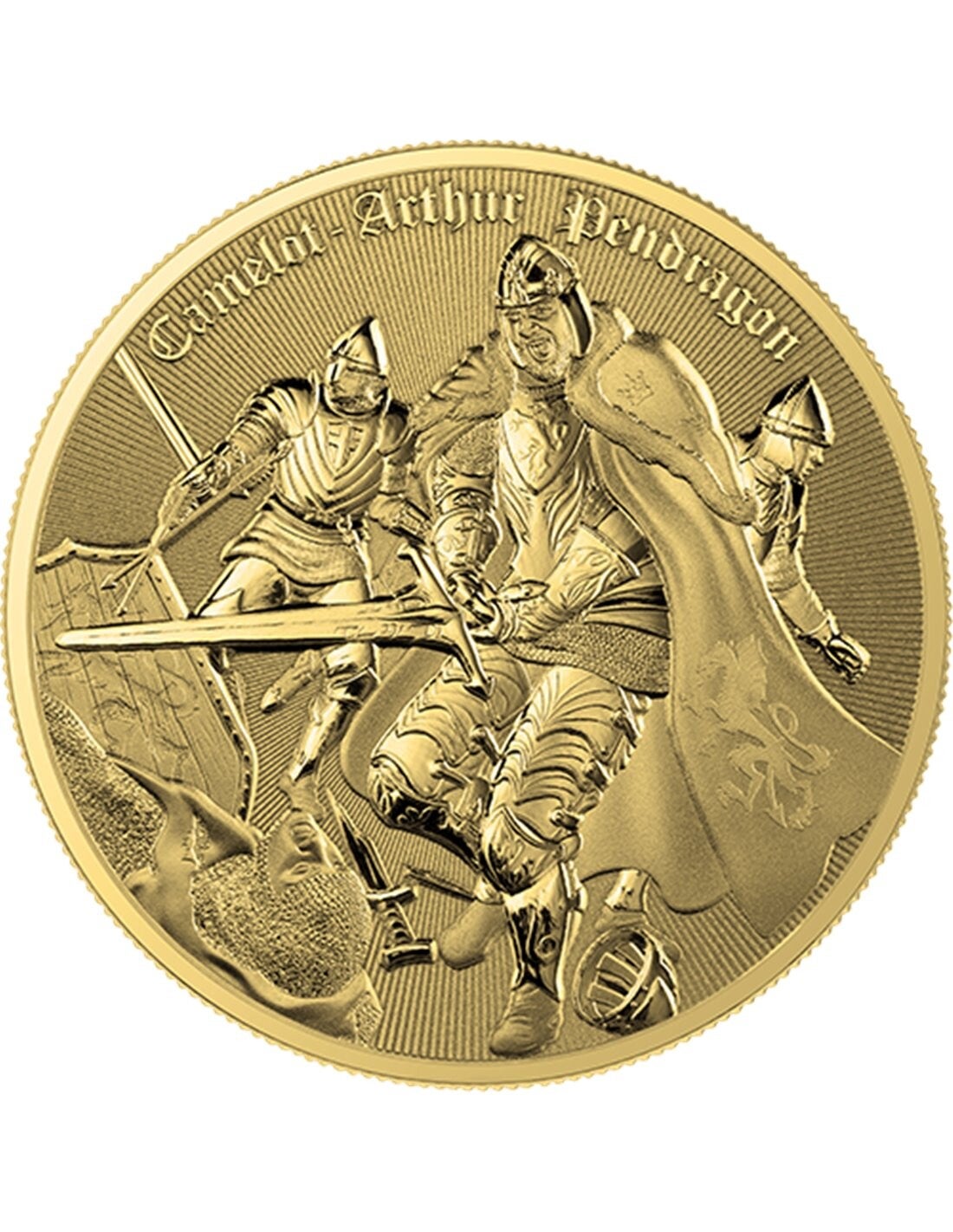 Auf der Vorderseite der Münze sind die zwölf Schilde und die Namen von zwölf Häusern von Camelot zu sehen, neben Arthur Pendragon, dem König von Britannien, sowie elf weiteren Rittern, die die nächsten Veröffentlichungen der Serie darstellen werden.