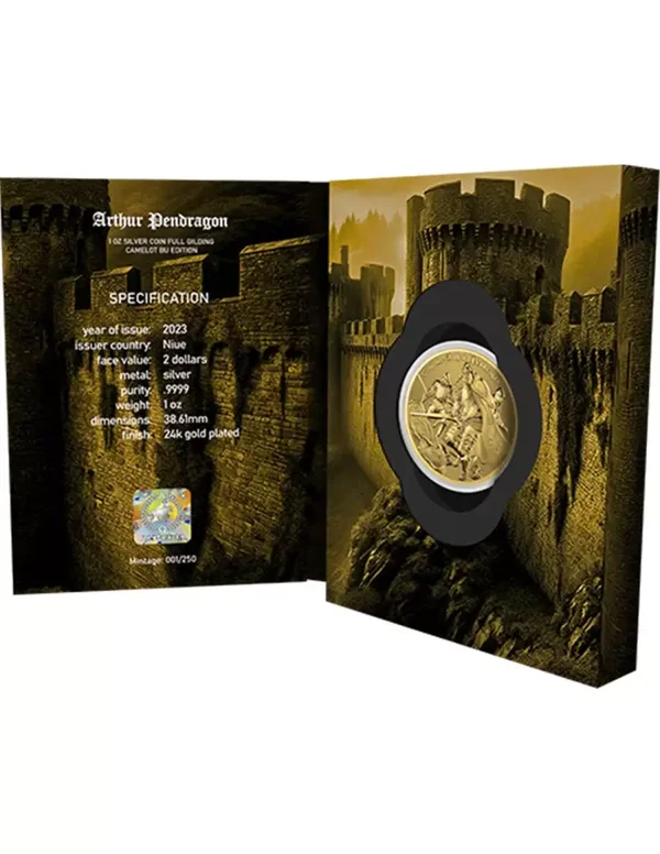 Wir freuen uns, Ihnen die atemberaubende Arthur Pendragon Camelot 1oz .999 Silbermünze mit 24k Goldvergoldung aus Niue vorzustellen, die für das Jahr 2023 geplant ist. Diese Münze, die in limitierter Auflage erscheint, präsentiert eine zeitlose Darstellung des legendären Königs Arthur, veredelt mit exquisiter 24k Goldvergoldung, um die komplexen Details des Designs hervorzuheben. Jede Münze wird sorgfältig aus 1 Unze 999er Feinsilber gefertigt, was sowohl außergewöhnliche Qualität als auch Sammlerwert garantiert. Der Nennwert der Münze von 2 Niue-Dollar macht sie zu einem gesetzlichen Zahlungsmittel im Land, was ihre Attraktivität sowohl für Sammler als auch für Enthusiasten erhöht.