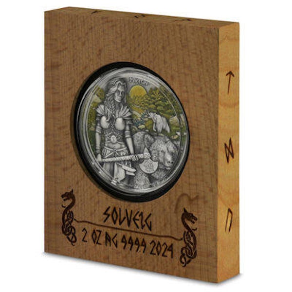 Auf der Vorderseite wird Solveig, die Sonnengöttin, von einem furchtlosen und mutigen Bären begleitet. Die Walküre selbst führt eine Axt und trägt einen Lederrock sowie Riemen, die ihren Körper umschließen, sowie eiserne Schulterklappen und Armbänder. Sie ist mit der Rune von Sowilo verziert, einem Symbol für Wärme und Energie, das ihr eine Wiedergeburt in Herrlichkeit ermöglicht. Diese Ausgabe ist weltweit auf nur 999 Stück streng limitiert.