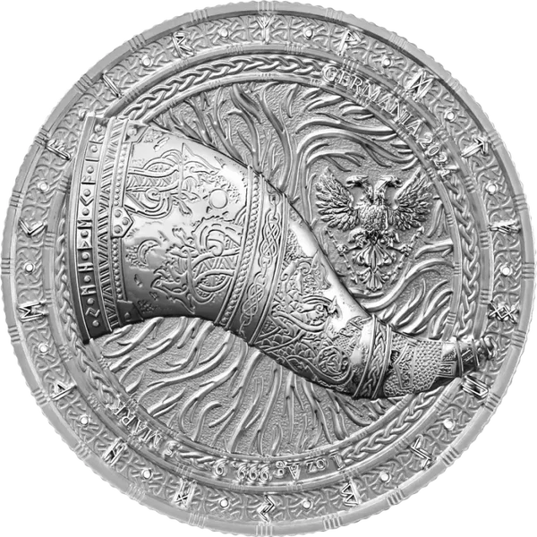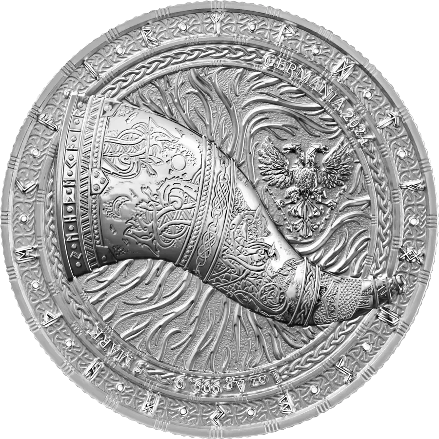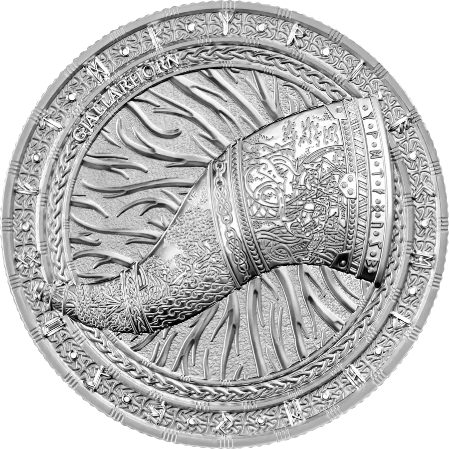 Artefakte 2024: Gjallarhorn 1 oz Silber BU – das mythische Horn von Heimdall, dem Wächter von Asgard und Beschützer der Bifrost-Brücke, verbindet die Welt der Götter mit Midgard, dem Reich der Menschen. Heimdall, der über außergewöhnlich scharfes Gehör und Sehvermögen verfügt, sorgte dafür, dass keine Bedrohung Asgard durchdringen konnte. Während Ragnarök, der ultimativen Schlacht zwischen Göttern und Riesen, ist es der Klang des Gjallarhorns, der die Götter auf das bevorstehende Schicksal aufmerksam macht. Der kraftvolle, himmelszerreißende Klang des Horns wird durch alle neun Welten hallen und das unvermeidliche Ende der Zeiten signalisieren.