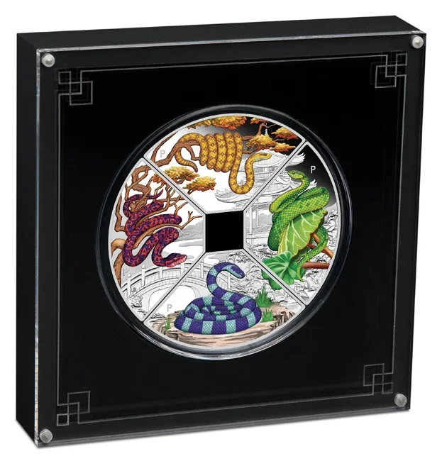 Der Tuvalu: Jahr der Schlange Quadrant Satz 4 x 1 Unze Silber 2025 Proof ist ein Sammler- und Anlageprodukt, das doppelte Darstellungen von Schlangen zeigt.